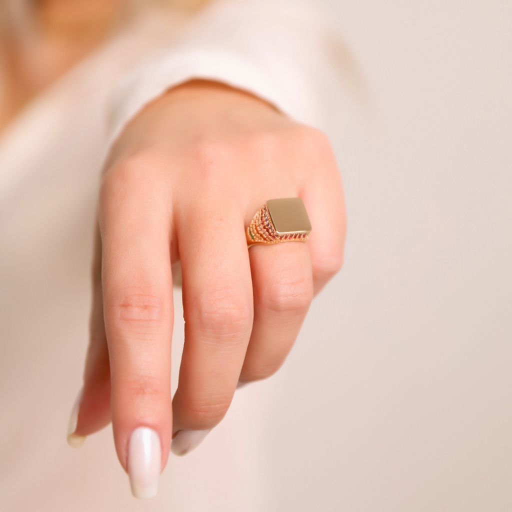 ANEL QUADRADO LARGO CRAV. LATERAL COLORS BANHADO A OURO