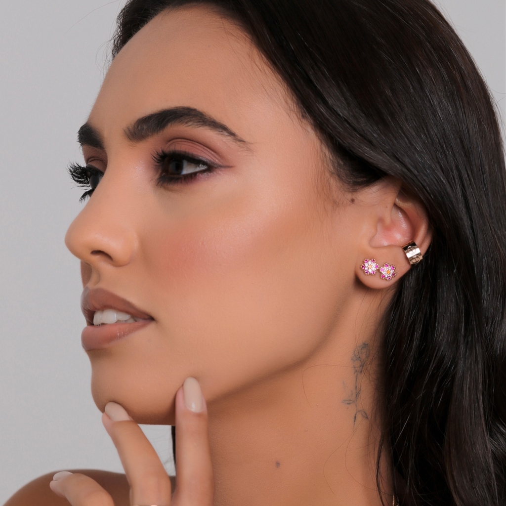 BRINCO FLORZINHA ZIRCONIAS ROSA BANHADO A OURO