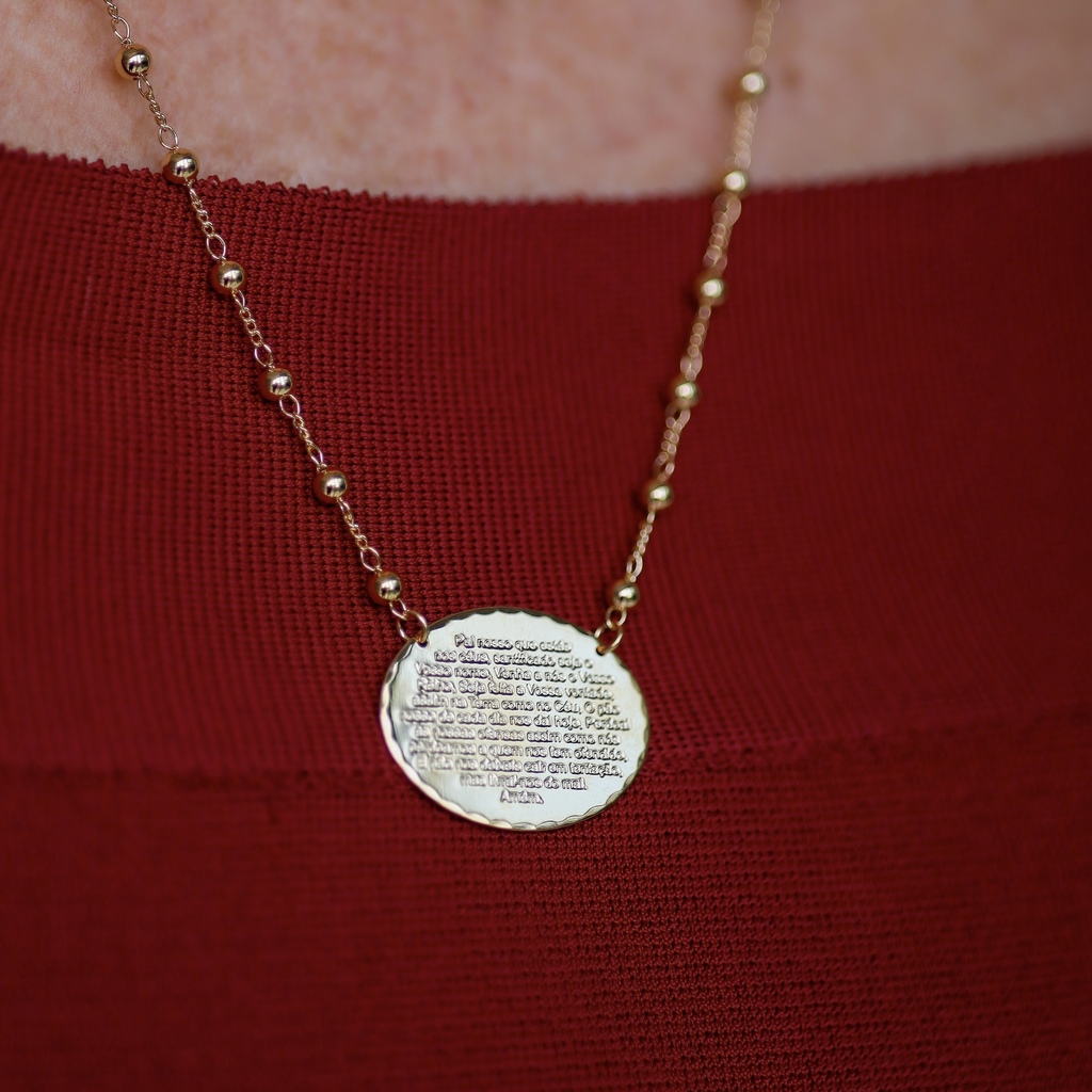 COLAR BOLINHAS PLACA OVAL PAI NOSSO BANHADO A OURO
