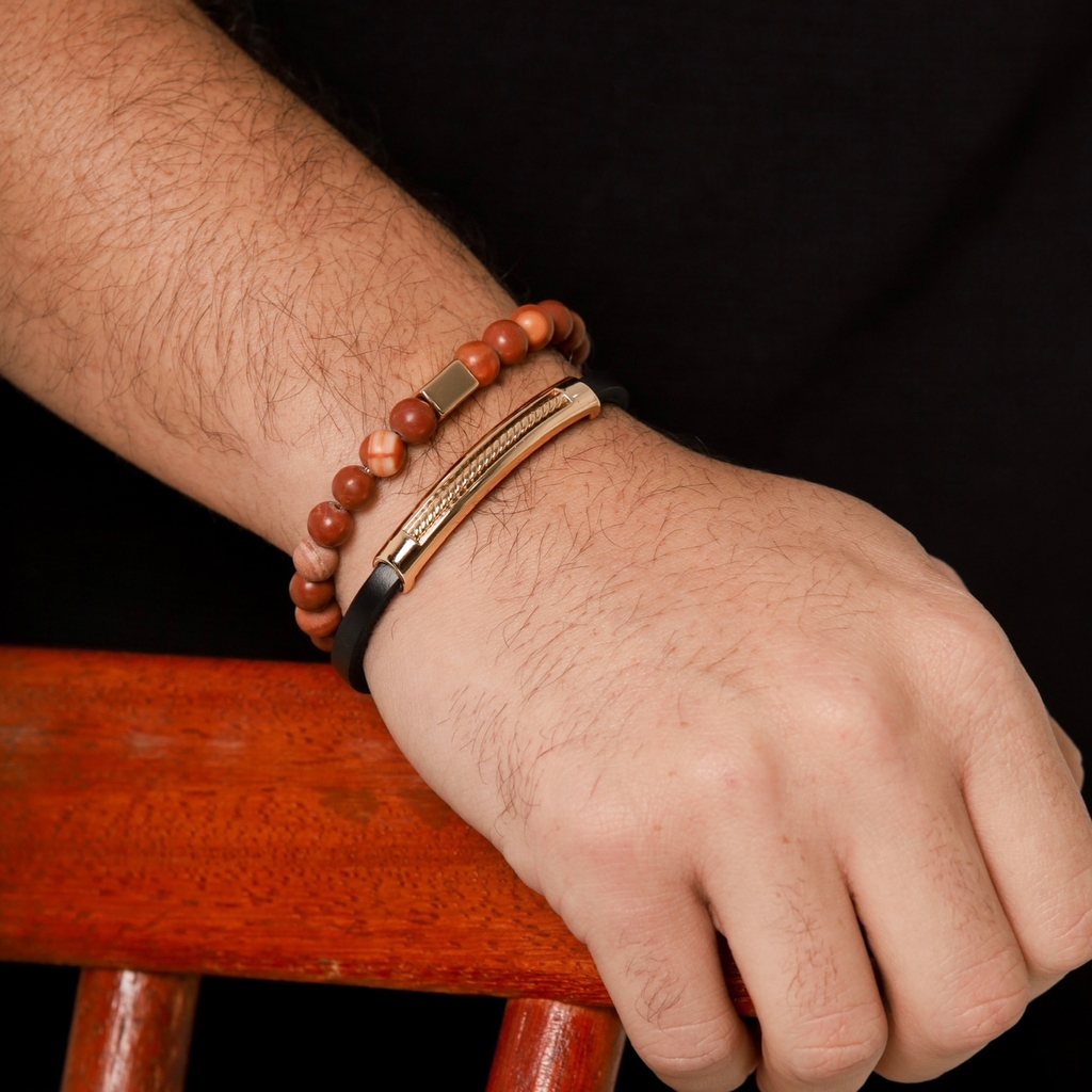 Pulseira Masculina feita em pedra natural Jaspe Brown de 8MM na cor marrom. Contém pingente retangular em metal dourado